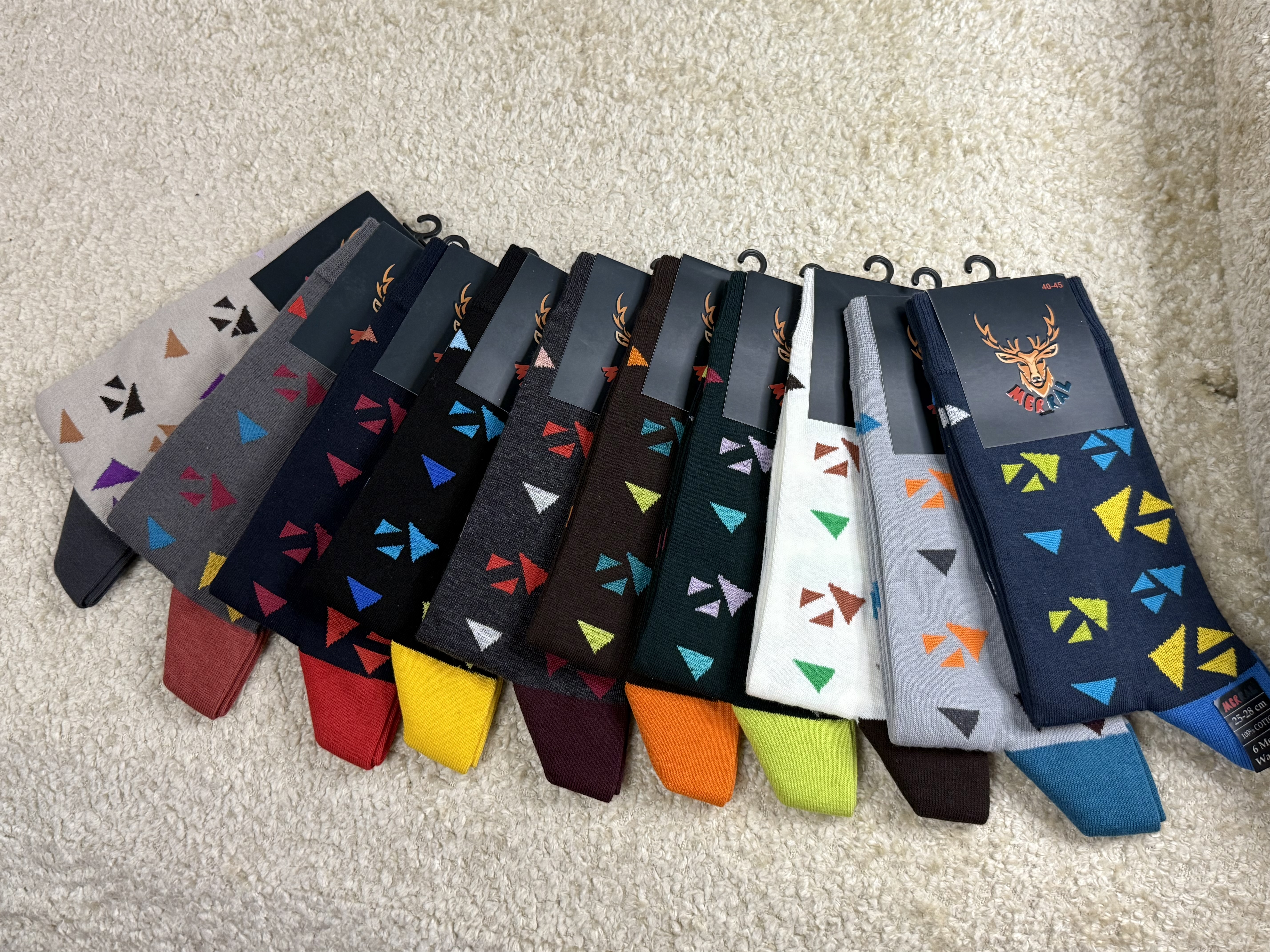 جوراب های مردانه مرال مناسب سایز ۴۰-۴۵ در دسته: ساقدار، نیم ساق، مچی، زیر قوزکی، کالج در انواع : ساده، طرحدار، اسپرت وجود دارد که تمامی جوراب ها با استفاده از تکنولوژی روز دنیا بافته و از نخ پنبه درجه ۱ به صورت ۱۰۰٪ استفاده میشود خاصیت آنتی باکتریال ضد بو و حساسیت پنجه و پاشنه دولایه و پنجه گیری شده به منظور استحکام و راحتی بیشتر میباشد